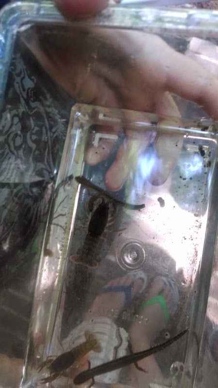 Ok, so now I am 6 months behind and starting a new year on the calendar...while I am still attempting to update this blog (which has more turned into a family yearbook more than anything else at this point). Our June started off with a trip to Raleigh to take the hubs to the airport. Daddy (the perpetual student) was heading to Lubbock to work on his Ph.D. While we were in Raleigh, we spent some time with my bestie. Her youngest is the same age as my boys. So he took them out exploring their neighborhood and the creek that runs through it. They came home with some friends...of the aquatic/marine nature.